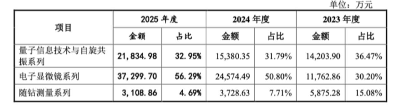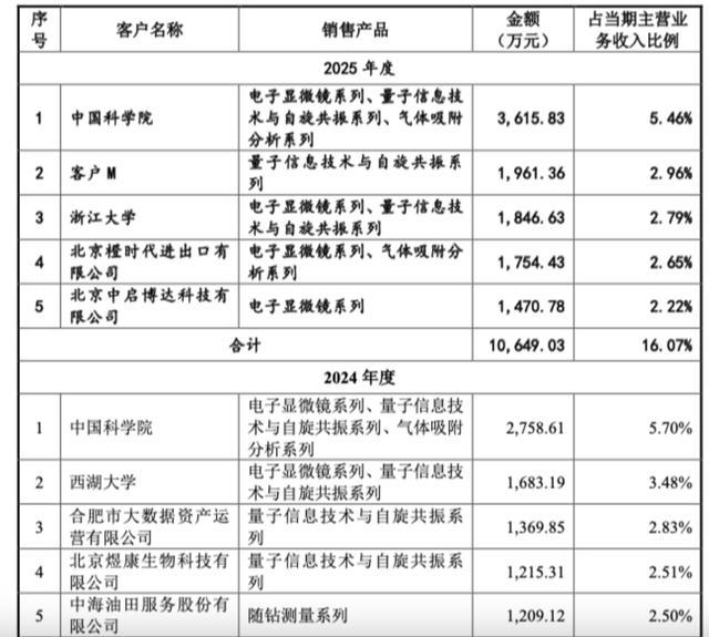 尽管公司以量子信息技术为起点,但电子显微镜才是真正的“现金牛”。从营收来看,2024年、2025年,电子显微镜系列的营收占比均超过50%;2025年前五大客户(中国科学院、浙江大学、北京橙时代进出口有限公司等)采购中,电子显微镜系列产品占据了主导地位。